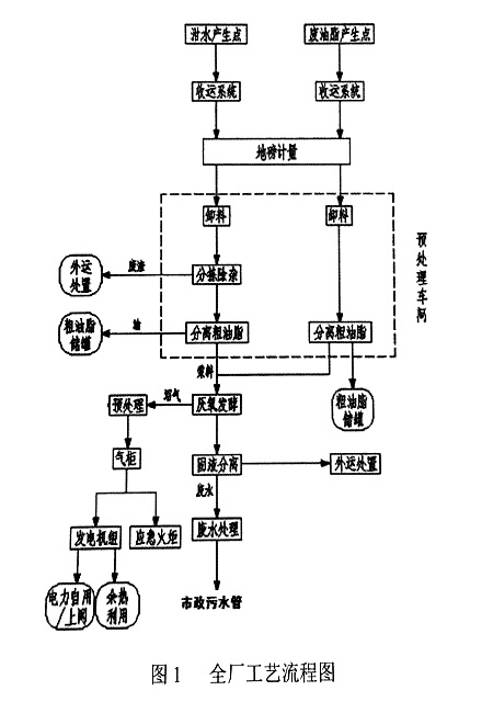 工艺简介:本项目餐厨垃圾处理果用“预处理+厌氧发酵+沼气热电联产”工艺,密闭运输、封闭生产,预处理分离出的废油脂外协至有资质的企业炼制生物柴油,厌氧发酵制取的沼气进行热电联产利用,产生的电能除自用外,多余部分并网输送至市政供电系统:发酵残渣经脱水后与预处理产生的分拣渣一同送临近的生活垃圾生填埋场处置:产生的沼液进入废水处理站,采用“预处理单元+生化处理单元+深度处理单元”的处理工艺,达《污水综合排放标准》(GB 8978-1996)中三级标准后排入附近市政管网:废气处理采用生物滤池处理工艺达到 《恶臭污染物排放标准》(GB 14554-1993)后通过15m高排气简排放。